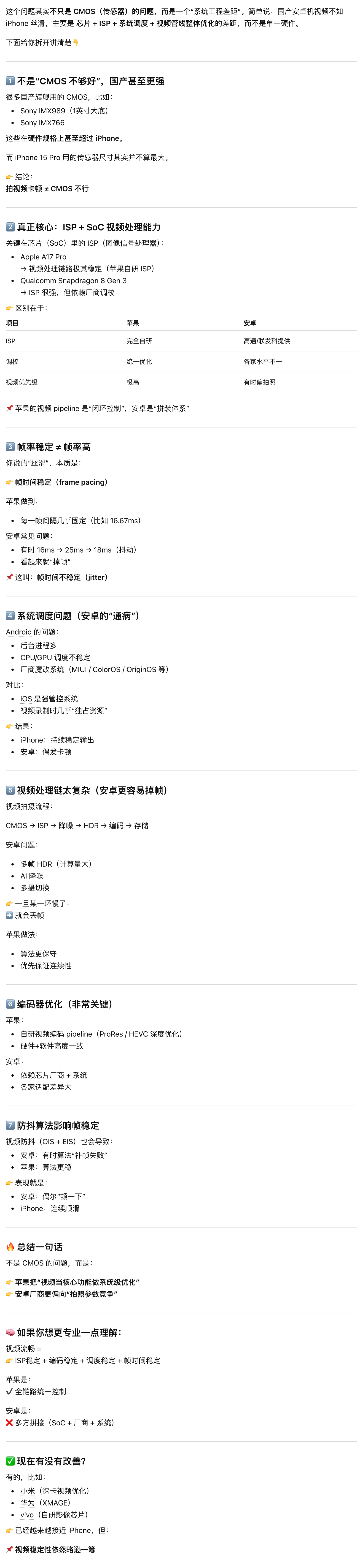 为什么安卓手机影像拍视频都容易掉帧,没有苹果手机丝滑,是因为缺少高速cmos原因吗?对于此问题,询问了ai,下面是ai的解答,仅供参考